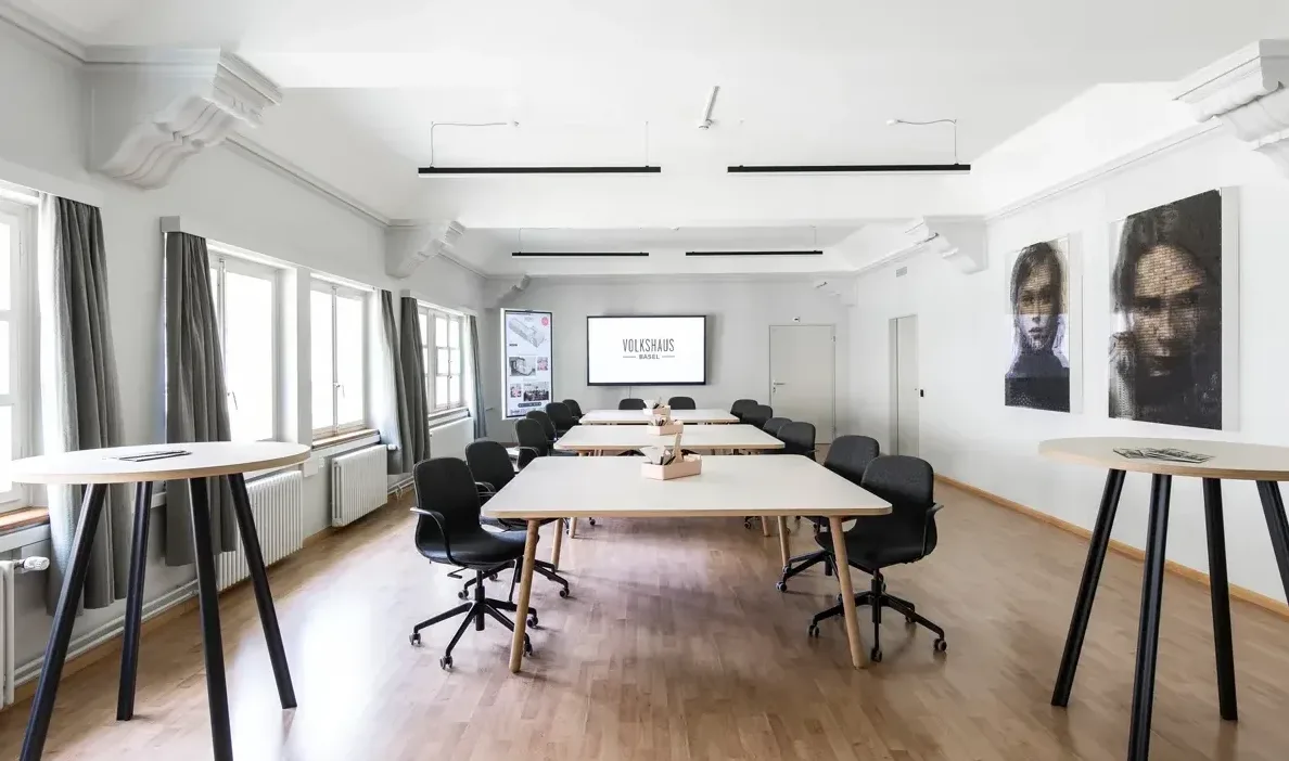 Summer meetings at Volkshaus Basel with day package, lunch, drinks, coffee breaks, after-meeting drink, and optional Rhine swimming.
