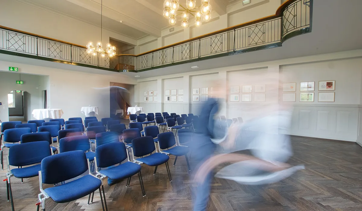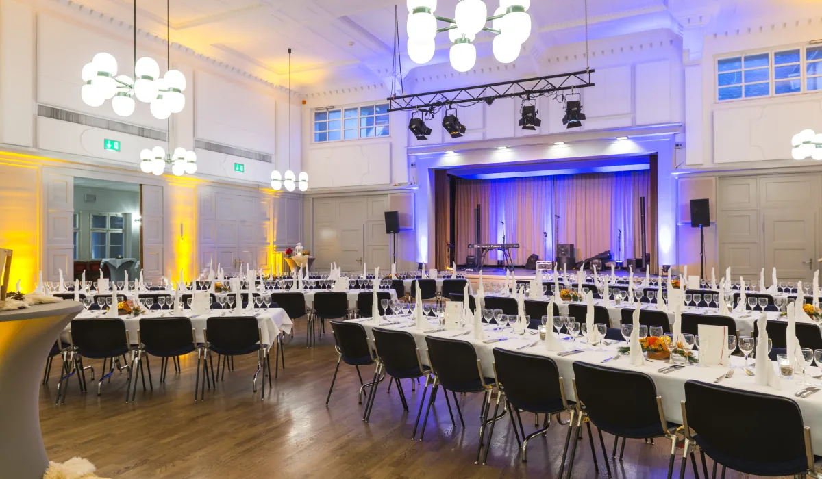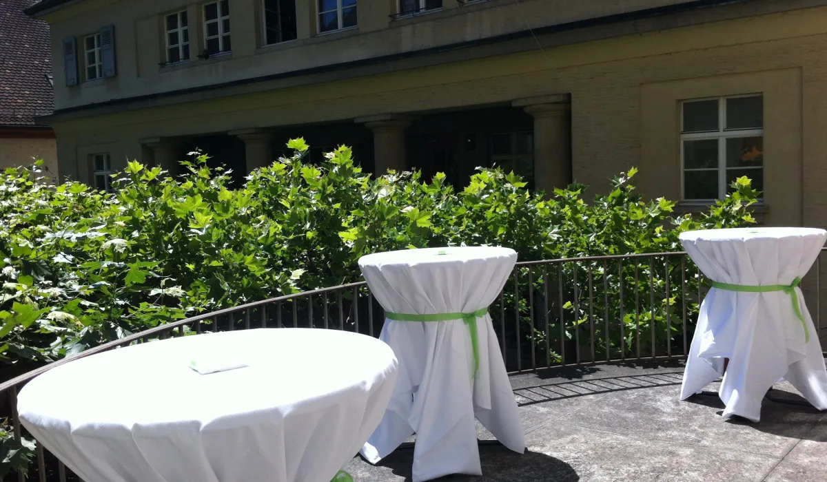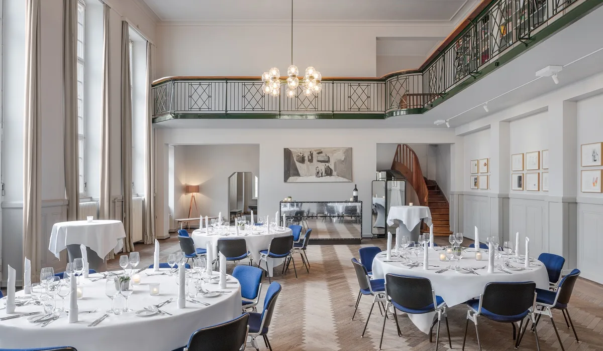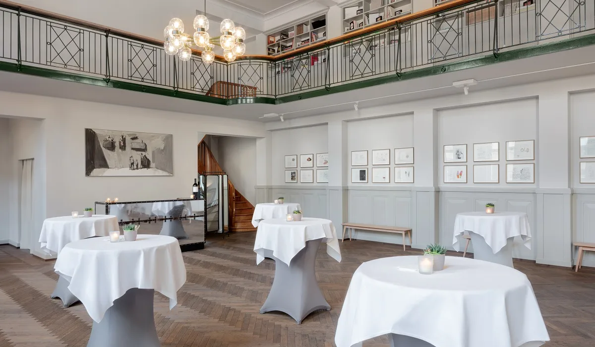 Der Kleinste ist gleichzeitig der Schönste: Die Volkshaus Galerie verfügt über eine eigene Terrasse in den baumbedeckten Innenhof und ein Galerie-Geschoss. Die ehemalige Bibliothek erlaubt Anlässe von bis zu 100 Personen in gediegener Atmosphäre und Blick in den Innenhof.