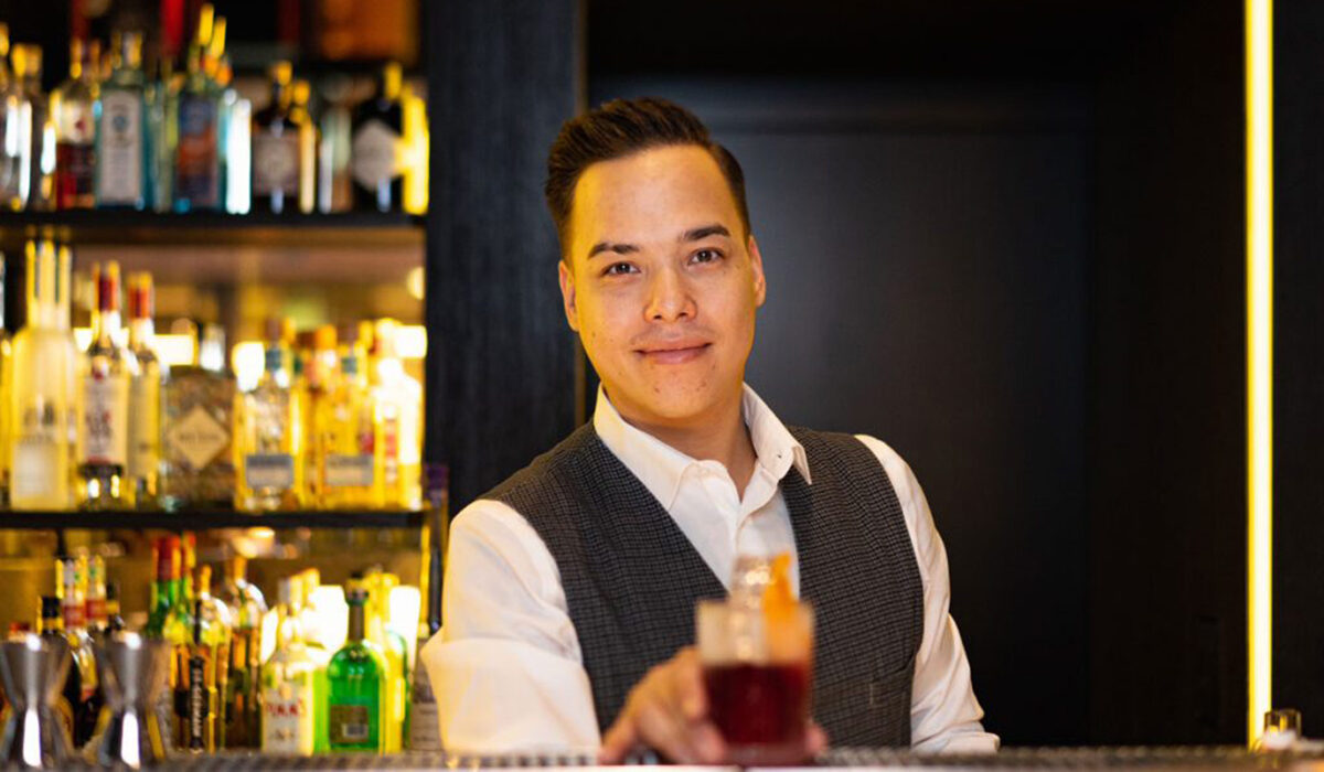 „Das Trinkkonzept der Imi Bar beinhaltet viel Lokales mit saisonalen Schwerpunkten, ist sehr simpel und nur wenig mixologisch angehaucht, weil der Ort selbst stärker belebt werden muss. Cocktailkultur ist vorhanden, aber Gäste müssen erst an diese herangeführt werden. Anders als in Großbasel poppt die Barszene in Kleinbasel erst auf“, skizziert der Barchef die örtliche Lage, wo es weniger gehobene Trinkstätten als am linken Rheinufer gibt. An einem meterlangen Metalltresen will der geborene Basler mit schottischen Wurzelns seitens des Vater und philippinischen Wurzeln seitens der Mutter nach langer, pandemiebedingter Auszeit endlich wieder Gäste empfangen. Ein Fokus auf Spirituosenkategorien wird neben stark nachgefragten Gütern wie Wein, Bier und Schaumwein nicht inszeniert. Die Barkarte gilt während des ganzen Tages wie auch in der Brasserie, die vom fünfköpfigen Imi Bar-Team versorgt wird.